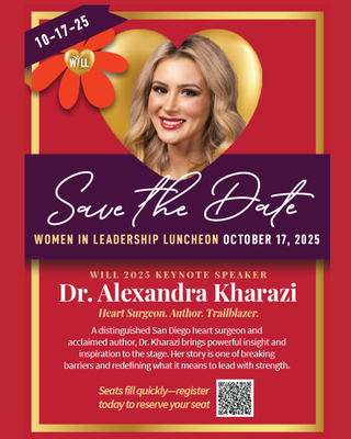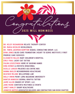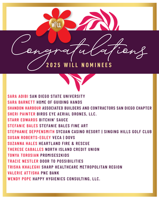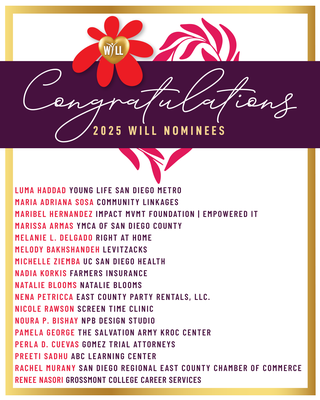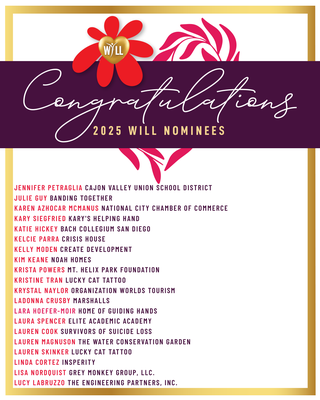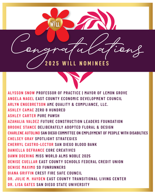 On Friday, October 17, 2025, the San Diego Regional East County Chamber of Commerce will be celebrating its 23rd Annual Women in Leadership event at Sycuan Casino Resort. In 2003 the first Women in Leadership Luncheon (WILL) was launched with the idea of honoring women who excel professionally and as community leaders. The successful women of San Diego County, along with our inspirational keynote speakers, keep WILL growing year after year. The heart of WILL centers around each years' nominees: women who demonstrate exemplary character, integrity, and leadership. The roster of awardees over the past 22 years is a genuine San Diego honor roll.