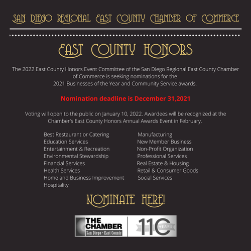 The 2022 East County Honors Event Committee of the San Diego Regional East County Chamber of Commerce is seeking nominations for the 2021 Businesses of the Year and Community Service awards.