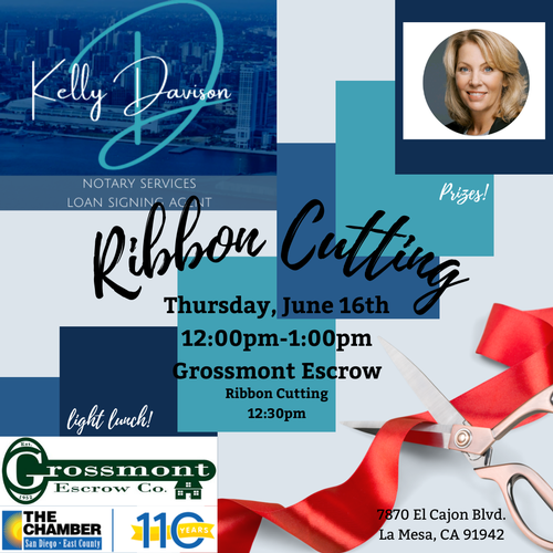 6/16 Ribbon Cutting Kelly Davison Notary Public Date and Time Thursday Jun 16, 2022 12:00 PM - 1:00 PM PDT Thursday, June 16th 12:00pm - 1:00pm Location Grossmont Escrow 7870 El Cajon Blvd. La Mesa, CA 91942 Fees/Admission FREE! Light lunch & prizes Set a Reminder Enter your email address below to receive a reminder message. Email address Select the amount of Days before the event -- Select Days Before Event -- 1 Day 2 Days 3 Days 1 Week Captcha Validation Please complete the Captcha Submit Set a Reminder Enter your email address below to receive a reminder message. Email address Select the amount of Days before the event -- Select Days Before Event -- 1 Day 2 Days 3 Days 1 Week Captcha Validation Please complete the Captcha Submit Share × Print Email Add to Calendar Facebook Twitter LinkedIn Tell a Friend × Select Calendar Type × Google Yahoo iCal (Outlook, Apple, or other)