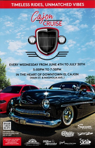 Downtown El Cajon’s beloved Cajon Cruise — formerly known as Cajon Classic Cruise — returns this summer with a streamlined schedule and an exciting showcase of vehicles that blend nostalgic classics with the latest in modern automotive design. This year, the event runs every Wednesday in June and July from 5:00pm to 7:30pm. Cajon Cruise is Downtown El Cajon’s weekly rendezvous celebrating timeless rides and unmatched vibes. Each Wednesday, Main Street comes alive with gleaming chrome, revving engines, and a welcoming atmosphere where car enthusiasts and families mingle among a dynamic lineup of vintage treasures and contemporary machines. It’s a relaxed, family-friendly hangout where you can admire stunning vehicles, enjoy live music, and grab a bite under the neon lights of Downtown. Come for the cars, stay for the community — Cajon Cruise is the midweek tradition that keeps El Cajon rolling.