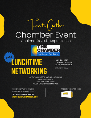 Come Celebrate with the San Diego Regional East County Chamber of Commerce each month as we recognize our Chairman’s Club Level Members. All Members and Prospective Members are invited to this Free (with registration) Lunch Event Sponsored by MI-BOX Moving & Mobile Storage.