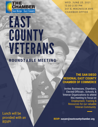 The San Diego Regional East County Chamber of Commerce would like to invite Businesses, Chambers, Elected Officials, Cities, Schools, and Veteran Organizations to attend our East County Veterans Roundtable Meeting. The focus of this meeting will be on employment, training and resources for our valuable Veteran Community. The Chamber welcomes your passion, interest, and attendance.