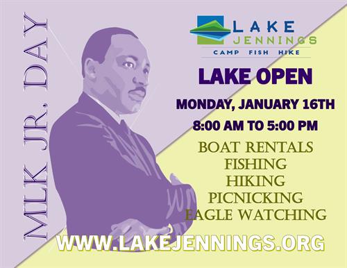 To honor the legacy of Dr. King, the lake will be open for boating, fishing, hiking, picnicking, eagle watching and more on Monday, January 16th from 8:00 a.m. to 5:00 p.m.