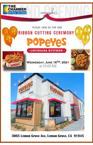 Popeye's Louisiana Kitchen Ribbon Cutting Date and Time Wednesday Jun 16, 2021 10:00 AM - 11:00 AM PDT Location 3065 Lemon Grove Avenue Lemon Grove, CA 91945 Set a Reminder Enter your email address below to receive a reminder message. Email address Select the amount of Days before the event -- Select Days Before Event -- 1 Day 2 Days 3 Days 1 Week Captcha Validation Please complete the Captcha Submit Set a Reminder Enter your email address below to receive a reminder message. Email address Select the amount of Days before the event -- Select Days Before Event -- 1 Day 2 Days 3 Days 1 Week Captcha Validation Please complete the Captcha Submit Share × Print Email Add to Calendar Facebook Twitter LinkedIn Tell a Friend × Select Calendar Type × Google Yahoo iCal (Outlook, Apple, or other)