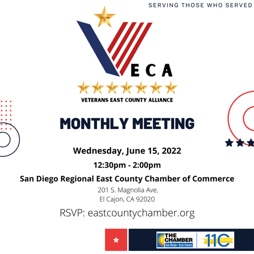Veterans East County Alliance will be meeting every second Wednesday of the month, from 1:00-2:30PM at the San Diego Regional East County Chamber of Commerce.